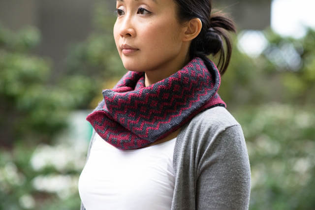 The pattern includes both charts and written instructions for the colourwork. We used CashLuxe Fine in Charcoal and Oxblood for this sample cowl, but our Tough Love Sock or Mohair Silk Sock would work equally well. Just find your favourite colour combination and go get the pattern on Ravelry here »