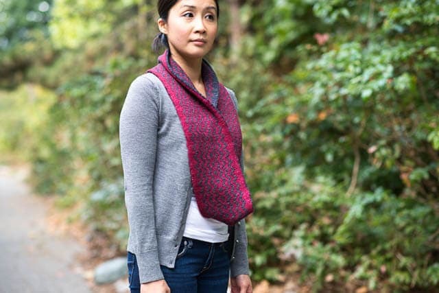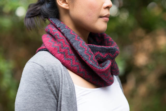 The Bloodwood Cowl is a unisex, two-colour, two-skein fingering-weight cowl that features a striking zig-zag colourwork pattern. Mitenae, a knitter and Ph.D student in Western Australia, was inspired by her landscape: