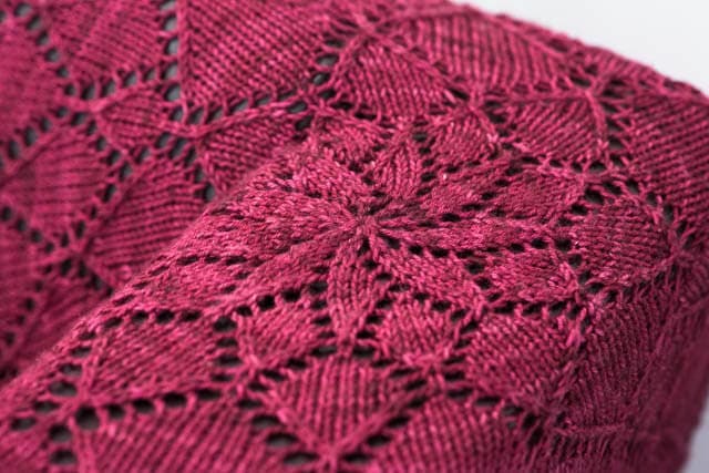 The shawl sample here is knit up in SweetGeorgia Merino Silk Fine in Orchid and the blanket sample is knit up in our new Trinity Worsted in Oxblood. The Merino Silk Fine gives the shawl beautiful drape and sheen, while the cashmere in the Trinity Worsted makes the blanket incredibly soft and cozy.