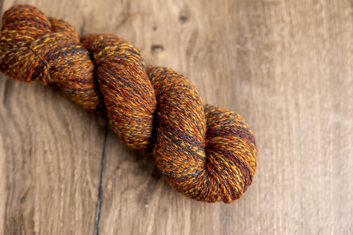 I went way out of my comfort zone by breaking up the colours of an otherwise perfectly dyed representation of my Winter Skies inspiration photo(s). Why? Because I wanted to showcase the colour to the maximum in the knitted fabric, and controlling the colour runs and plying them against the darkest colour (my favourite part of this colourway) allowed for a more contrasted marling in the finished yarn.”