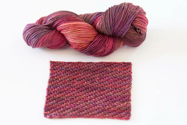 In that spirit, this month’s stitch is about meditation. Quiet, simple, repetitive stitches that invoke contentment and relaxation. I decided to use CashLuxe Fine with US 2 needles for a soft, delicate look; a perfect balance to the richness of the red tones.