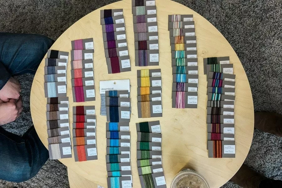 We made sure that the core colour collection would have all the hues well-represented and that there would be light and dark shades, vivid and muted tones as well. We wanted to make sure there would be colours that would all work together in harmony, whether it was in a run of graduated colours or in different families of blues, like purple blues vs green blues. We stripped out a lot of duplication with colourways that were very similar to each other, since those hues often caused anxiety when knitters were choosing colours… Linen or Birch? Hmm. Whitewater or Dreamboat?