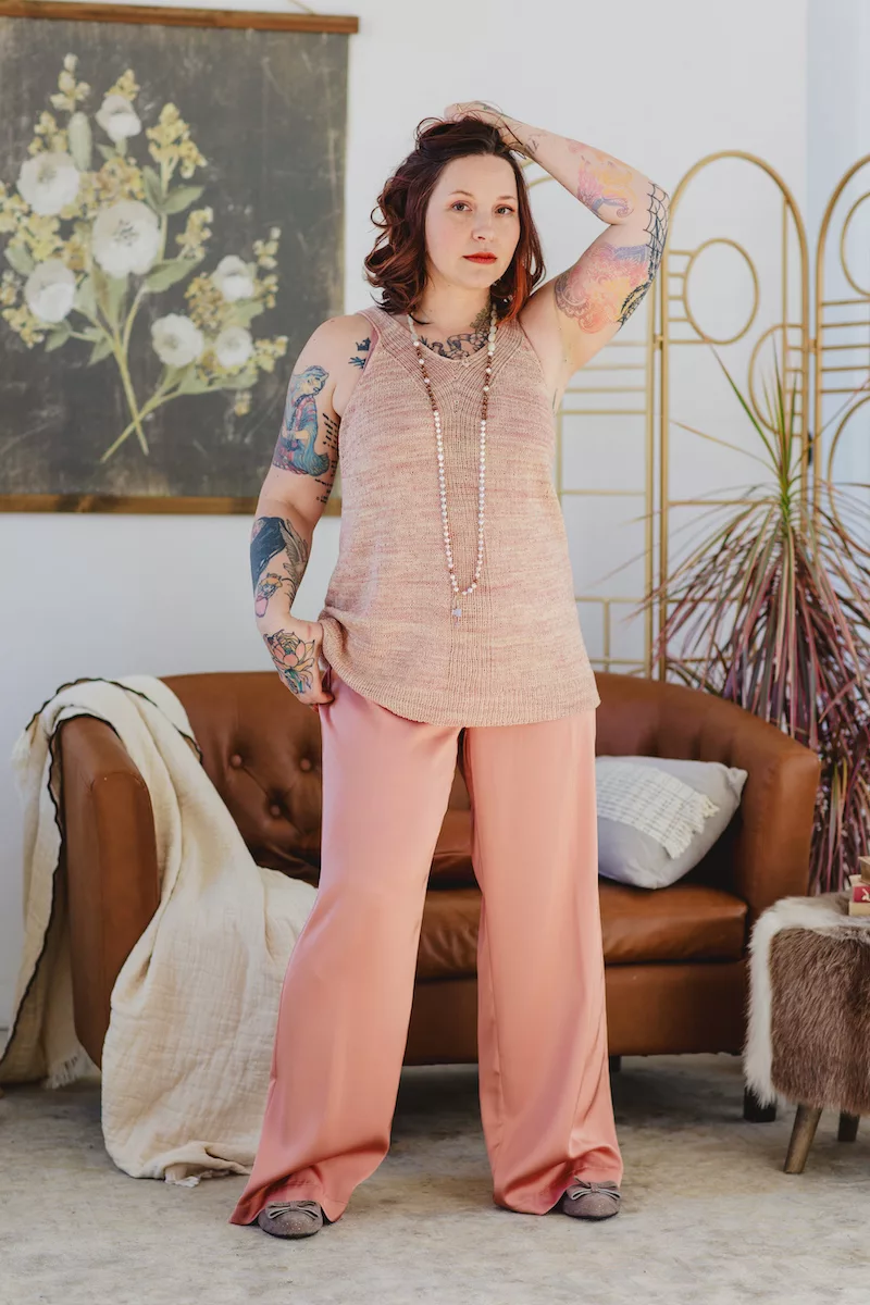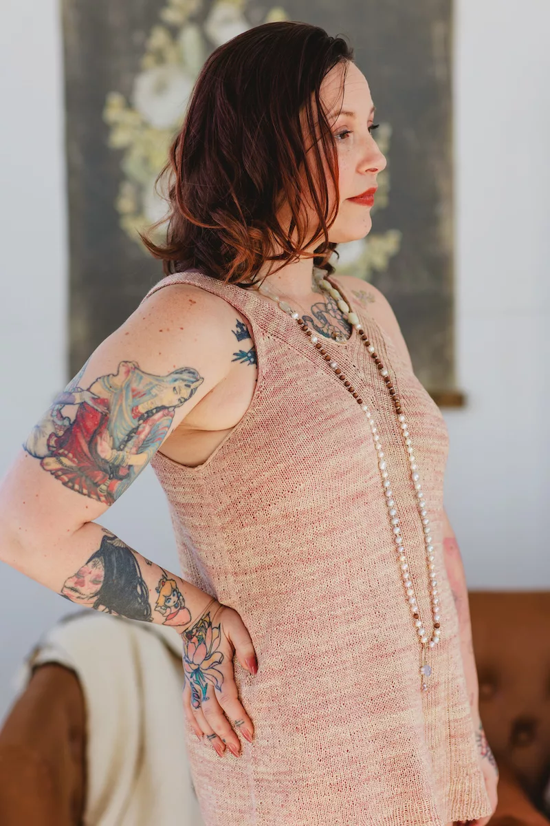 We’re delighted to have one of our SweetGeorgia yarn bases included in the new pattern collection from designers Elizabeth Margaret and Jen Parroccini of One Wild Designs. And as soon as I saw Elizabeth’s new Betty’s Mystique tank, swatching for the project was completely top of mind. Paired with our warm-weather friendly Flaxen Silk Fine yarn, this project is sure to be a new summertime staple.