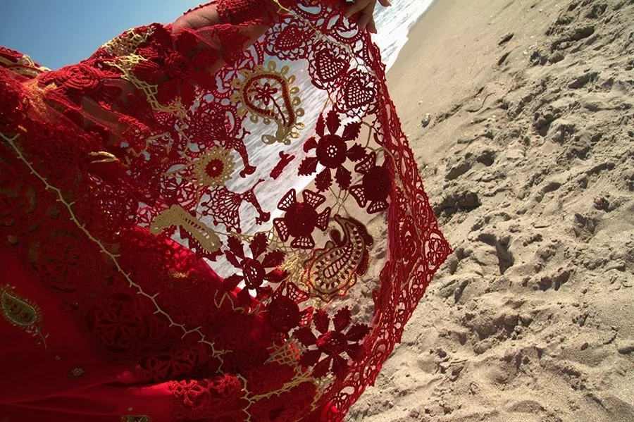 Like every one of us crafters, when faced with a significant celebration, we must create a special item. For me, it was my wedding veil. I chose to wear red on my wedding day to invoke the good luck, happiness, and joy in my distant Chinese heritage and the purity in my Indian heritage. My wedding dress would be an Indian saree and my reception dress would be a Chinese cheongsam.