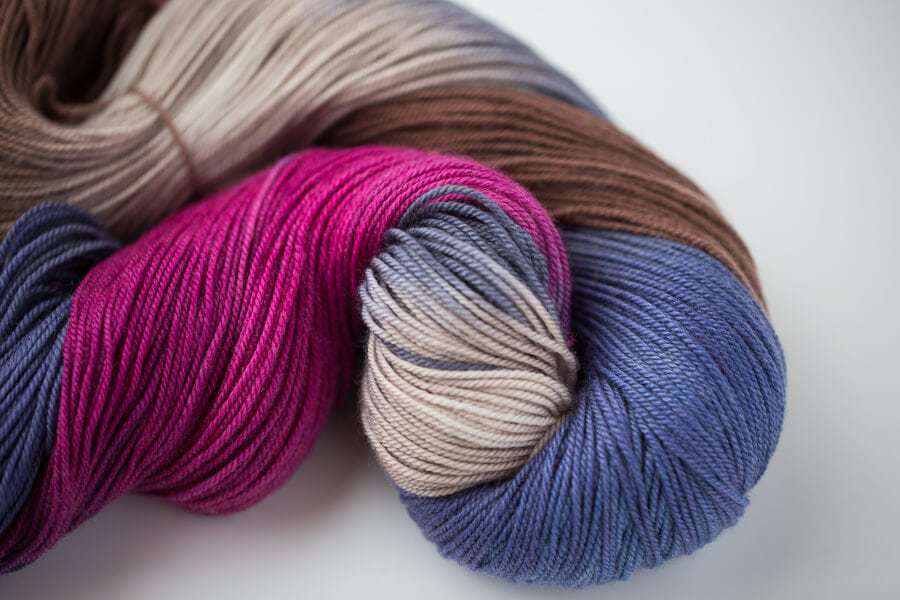 Returning home to my comfort zone, these are all my favourite hues blended into one gentle and restful handpainted skein. The rich chocolately auburn brown, with the deep and vibrant purple blue, and a shot of my favourite magenta. It’s something to wrap up and relax in. Time to hibernate.