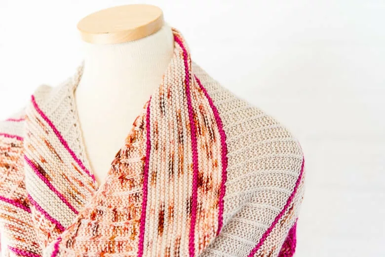 Colour gets playful in the gorgeous interplay of textural stitches and hints of lace. This sideways asymmetrical shawl captivates the knitter, allowing the imagination to come forth in both hue and form, for the perfect beginner lace project.