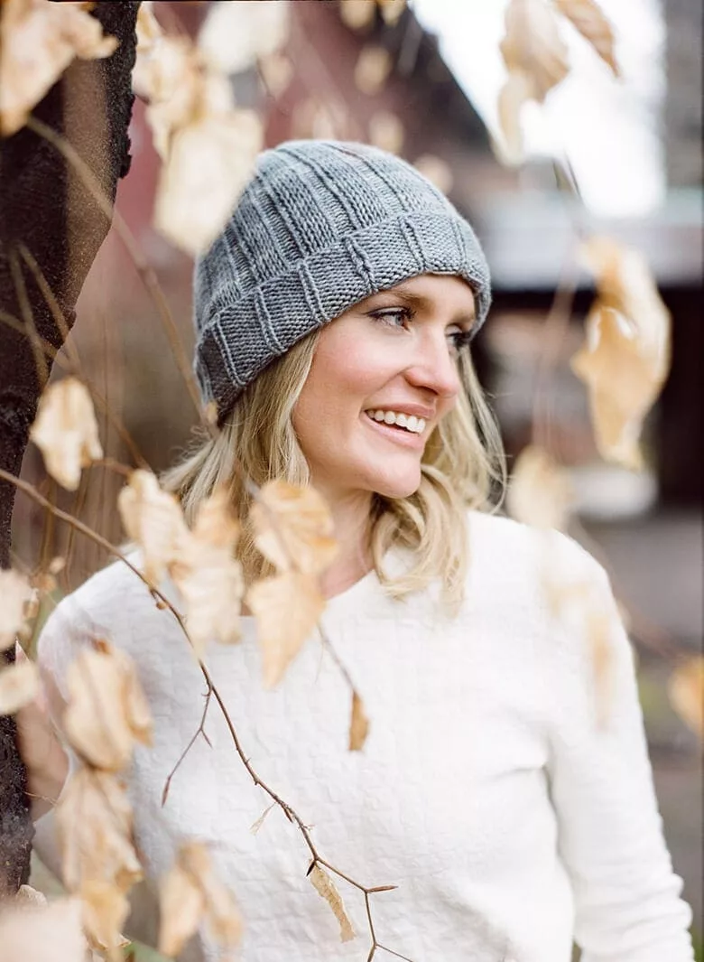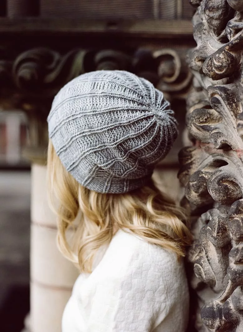 She thoughtfully used our Trinity Worsted for a cute hat called Suitable for Use, one that might fulfill an old requirement of having “no less than three hats” when traveling for a week to an old country house. It’s reversible, utilizing slipped stitches and twisted stitches for a unique ribbing effect.