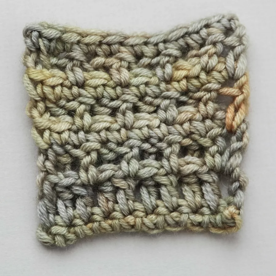 The method used in the Post stitch is simply “crochet below”. The idea is similar to ‘knit one below’ but instead of crocheting on the stitch two rows down, the stitch is crocheted on the post of the previous row. It creates an overlap between two rows which add to the thickness of the fabric. Alternating crochet one and crochet below (see sample below) can create a highly textured fabric.